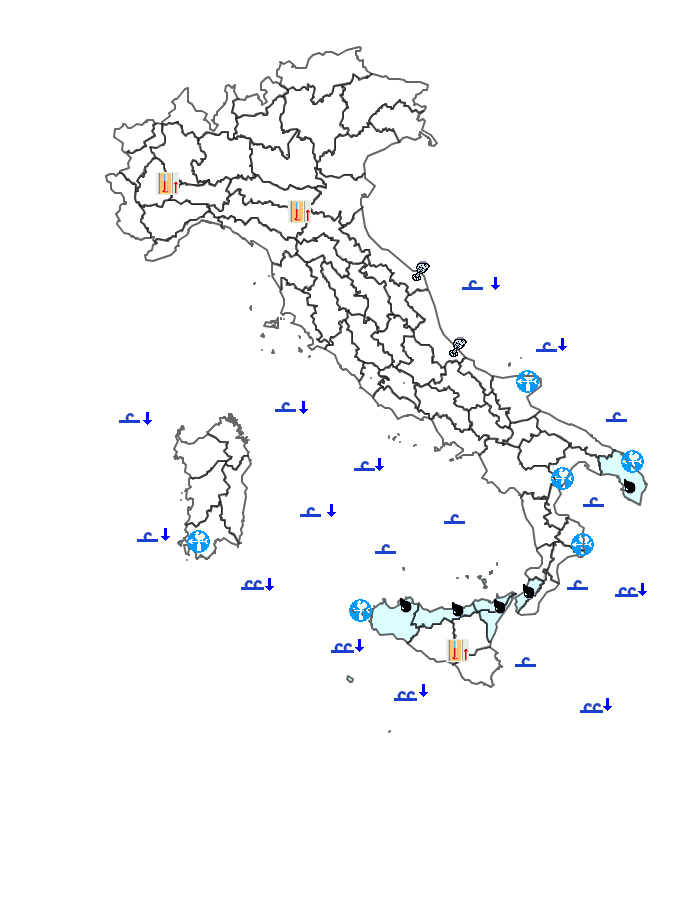 - sparse, anche a carattere di rovescio o breve temporale, su Calabria meridionale, Sicilia tirrenica e nord-orientale, con quantitativi cumulati da deboli a puntualmente moderati;